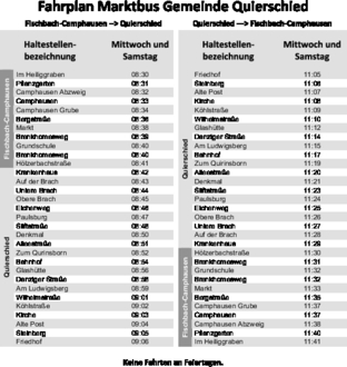 Seit 1. Juni 2018 finanziert die Gemeinde Quierschied eine Buslinie, welche zwei Mal pro Woche durch die Gemeindebezirke Fischbach-Camphausen und Quierschied fährt. Insbesondere älteren und mobilitätseingeschränkten Bürgerinnen und Bürgern wird damit kostenlos ermöglicht, wichtige Ziele ihres Alltags wie Einkaufsmöglichkeiten, Wochenmärkte, Arztpraxen oder Friedhöfe bequem zu erreichen. Durch eine Vielzahl an Haltestellen werden Wohngebiete erschlossen, in denen derzeit kaum Linienverkehr möglich ist.