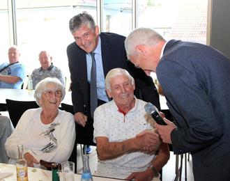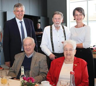 Bürgermeister Lutz Maurer (li.) und die stellv. Ortsvorsteherin Susanne Weidenfeld (re.) gratulieren Josef und Hildegard Houy (sitzend) sowie Paul Kolling (Mitte) aus Göttelborn.