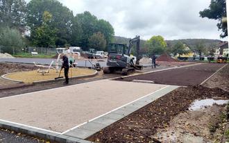 Anfang August erfolgte der symbolische Spatenstich – mittlerweile lässt sich bereits erahnen, welches Ausmaß der integrative Mehrgenerationen-Spielplatz im Lasbachtal haben wird: Vor einigen Tagen wurden bereits die ersten Spiel- und Sportgeräte installiert. Schon zuvor war der Untergrund (Planum) des Multifunktionsfeldes fertiggestellt worden, auf den im November der eigentliche Sportboden, ein sogenannter EPDM-Belag, aufgetragen wird. Auch wurden bereits die Sprunggrube sowie die Seiteneinfassung und die Tragschicht der Laufbahn fertiggestellt. Der spezielle Tennenbelag wird die Laufbahn zeitnah vollenden. Hinzu kommt, dass die Drainage des gesamten Areals ist bereits zu mehr 50 Prozent fertiggestellt wurde und auch schon der Revisionsschacht für die Entwässerungsleitung eingebaut wurde. Weitere Spielgeräte werden nach derzeitigem Stand im November folgen.