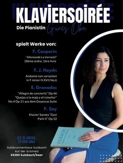 Die Musikschule Sulzbach-/Fischbachtal ist glücklich, sie seit einiger Zeit auch als Klavierpädagogin im Team zu haben und sieht mit Ihnen und hoffentlich vielen weiteren Konzertbesuchern mit großer Vorfreude der Klaviersoirée am Sonntag, dem 27.11.22 im Salzbrunnenhaus entgegen.