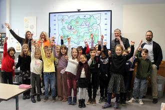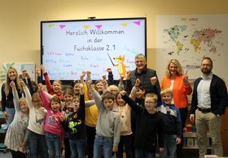 Die Kinder der Fuchsklasse (Klasse 2.1) mit ihrer Klassenlehrerin Alexa Burkholz, Vera Friedling, Bürgermeister Lutz Maurer und Yannick von Ehren (hinten, v.li.n.re.).