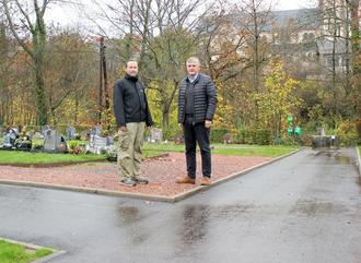 Ortsvorsteher Marcus Jung und Bürgermeister Lutz Maurer neben zwei der sanierten Gehwege auf dem Friedhof in Fischbach-Camphausen.