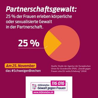 Jede dritte Frau in Deutschland ist mindestens einmal im Laufe ihres Lebens von physischer und/oder sexueller Gewalt betroffen. Ob Gewalt in der Partnerschaft, Mobbing, Stalking, Zwangsheirat, Vergewaltigung oder Menschenhandel - das Hilfetelefon „Gewalt gegen Frauen“ berät zu allen Formen von Gewalt. Über 100 qualifizierte Beraterinnen unterstützen unter der Telefonnummer 116 016, per E-Mail sowie im Sofort oder Termin-Chat auf www.hilfetelefon.de - kostenlos, anonym und vertraulich.