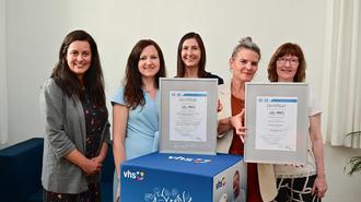Für die Volkshochschule konnten vhs-Direktorin Dr. Carolin Lehberger (l.), sowie die Programmbereichsleiterinnen Melanie Scazzari (3.v.l.) und Maria-Elena Korobov-Köhler (r.) die Zertifizierung von den Leitenden Auditorinnen Aline Leistenschneider (2.v.l.) und Nadine Jakob entgegennehmen.