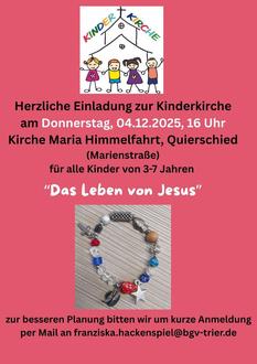 Am 05.12.2025 feiern wir den Herz-Jesu-Freitag in der Kirche St. Josef Fischbach. Um 17:30 Uhr wird das Allerheiligste ausgesetzt und wir beten an diesem Abend besonders um eine gnadenreiche Adventszeit und um den Frieden in der Welt. Um 18:00 Uhr feiern wir das Herz-Jesu-Amt, anschließend ist Glaubensgespräch im Pfarrheim zum Thema „Nikolaus war ein guter Mann, dem man nicht genug danken kann“