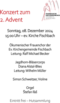 Herzliche Einladung zum alljährlichen Konzert am 2. Advent, Sonntag den 8. Dezember 2024, 15:00 Uhr in der Ev. Kirche Fischbach. mit dabei sind: