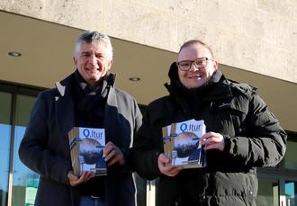 Bürgermeister Lutz Maurer (li.) und Robin Schmelzer präsentieren stolz das Programmheft "Q.ltur Highlights 2025".