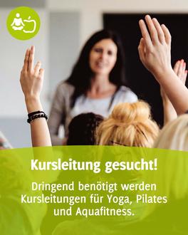 Wir sind dringend auf der Suche nach Honorardozent:innen für Yoga, Pilates und Aquafitness! Falls ein anderes Bewegungsangebot für Sie in Frage kommt, freuen wir uns auch dann über Ihre Nachricht.