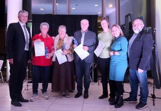 V.li.: Bürgermeister Lutz Maurer, die Ehrenpreisträger:innen Meta Fey, Astrid te Koppele, Dieter Krönder und Margarethe Wirges sowie Jessica Heide und Peter Saar.