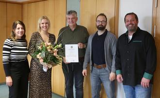 Zu den ersten Gratulanten von Michelle Weiland (2.v.li.) gehörten neben Bürgermeister Lutz Maurer (Bildmitte) auch die stellvertretende Hauptamtsleiterin Antje Dörr, Hauptamtsleiter Yannick von Ehren und der Vorsitzende des Personalrats, Karsten Schommer (v.li.n.re.).