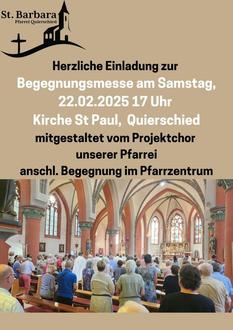 Eine erste Begegnungsmesse, mitgestaltet vom Projektchor der Pfarrei, wird am Samstag, 22.02.2025 um 17:00 Uhr in St. Paul stattfinden. Im Anschluss findet eine gemeinsame Begegnung statt.