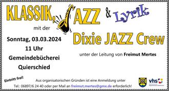 In Zusammenarbeit mit der Volkshochschule Regionalverband Saarbrücken heißt es am Sonntag 3. März um 11.00 Uhr wieder „Klassik, Jazz & Lyrik“. Zwischen den Bücherregalen kann man ein überraschendes Programm erleben: Wolfgang Mertes (Violine) bietet Virtuoses und Gefühlvolles, Klaus Krämer (Lyrik) Erlesenes und die Dixie Jazz Crew traditionellen Jazz an. Den Besuch wird niemand bereuen!