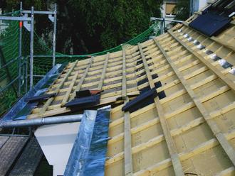 Um den Dachstuhl zu schützen, wird unter den Dachziegeln in der Regel ein Unterdach konstruiert. Es verhindert, dass Feuchtigkeit und kalte Luft von außen in die Dachkonstruktion eindringen und ist vor allem dann wichtig, wenn zwischen den Sparren in der Dachschräge der Dämmstoff eingebaut ist. Eindringender Schlagregen, Schnee oder auch kalte Außenluft würden die Dämmwirkung reduzieren.