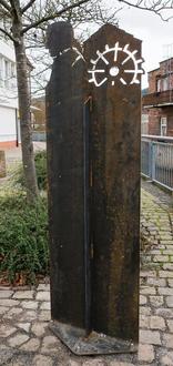Die Metall-Silhouetten in Lambrecht – bis jetzt wurden fünf Exemplare gezählt – geben zur Zeit der Bevölkerung besondere Rätsel auf. (Das Foto zeigt die Stele direkt neben dem Sandstein-Walkmühlen-Erinnerungsdenkmal auf dem Friedrich-Ebert-Platz).