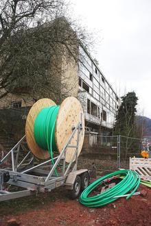 Das Bild der Seniorenhaus-Ruine in Verbindung mit den Glasfaserverlegungsarbeiten mag täuschen. Es wird noch nicht an der Bauruine gearbeitet … aber jedenfalls ist der Glasfaser-Anschluss für schnelles Internet schon mal hergestellt.