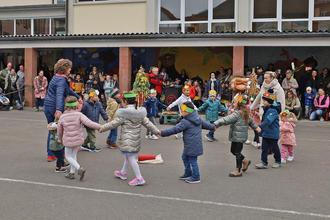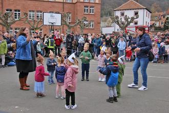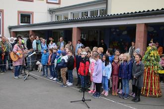 Schüler der Grundschule Lambrecht mit Lehrerin Andrea Knoll singen Lieder vom Frühling, vom Regenbogen, von der Jahresuhr und von den Jahreszeiten