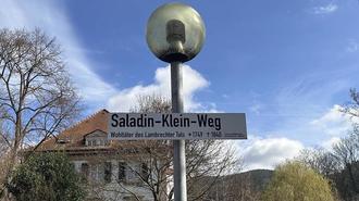 Sein Erbe und seine Taten dürfen nicht in Vergessenheit geraten war mein erster Gedanke und glücklicherweise wird er nun in der neuen Lambrechter Audiotour gebührend gewürdigt. Einer ihm gewidmete Straße oder einen Platz oder gar ein Denkmal findet man in Lambrecht nicht. Bei meiner Suche habe ich auch keinen Grabstein gefunden. Dann wurde ich doch noch fündig auf einem kleinen Weg auf dem Schulgelände der Realschule +, von der Wiesenstraße über den Speyerbach Richtung Turnhalle/SBK Parkplatz. Zwei Wegschilder mit der Aufschrift "Saladin-Klein-Weg Wohltäter des Lambrechter Tals 1749 - 1840", habe ich dort entdeckt. Die Schilder hat der ehemalige Förderverein Sauerbrunnen-Denkmalpflege e.V. Lambrecht im Jahre 2010 in Gedenken an Saladin Klein angebracht.