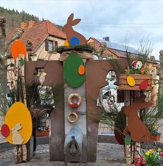 Für die Gestaltung des Osterbrunnens wurden ausschließlich Naturmaterialien verwendet. Die Holzeier und Hasen wurden selbst hergestellt und mit verschiedensten Naturmaterialien geschmückt. Frühlingsblumen ergänzen das Ganze zu einem farbenfrohen Osterkleid. Ein großer Dank für die gespendeten Blumen geht an den Blumenladen Floristik Pur im Herzen von Lambrecht.
