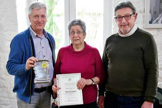Ruth Liebrich wurde zum Ehrenmitglied der Ortsgruppe Lambrecht des Pfälzerwald-Vereins ernannt. Links Vorsitzender Gunther Weber, rechts der stellv. Vorsitzende Reiner Heckmann.