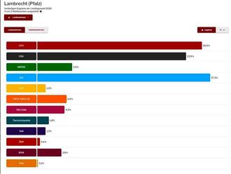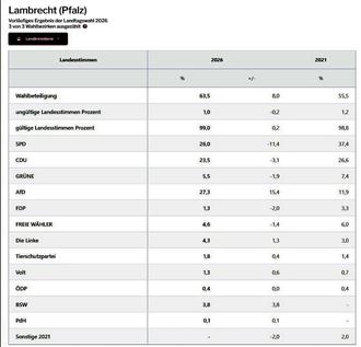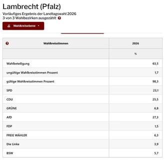 Lambrecht. (WD) Bei den Landtagswahlen 2026 entfielen in Lambrecht bei den Erststimmen (Direktkandidaten) 23,1 % auf SPD, 25,5 % auf CDU, 27,3 % auf AFD und 6,8 % auf Grüne.