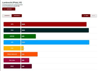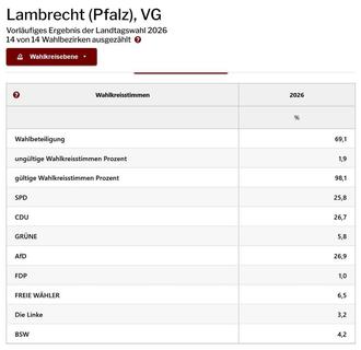 Lambrecht. (WD) Bei der am 22. März 2026 stattgefundenen Landtagswahl in Rheinland Pfalz erhielt auf Landesebene die regierende SPD 25,9 %, CDU 31,0 %, Grüne 7,9 % und AFD 19,5 % der Stimmen. Alle anderen Parteien blieben unter der 5% - Hürde. Die bisher an der Regierung in Mainz beteiligte FDP erreichte bei dieser Wahl nur 2,1 % und verpasste den Einzug in den Landtag.