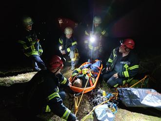 Am Kapellenberg angekommen wurde die Feuerwehr bereits vom fiktiven Großvater des verunfallten Kindes empfangen, der dem Einsatzleiter erste Informationen mitteilen konnte. Daraufhin ließ der Einsatzleiter den Angriffs- und Wassertrupp, ausgerüstet mit Handlampen und Erste-Hilfe Rucksack, das Gelände rund um den Kapellenberg absuchen. Bei der Suche fand der Angrifstrupp neben der Kapelle im Gebüsch ein Kuscheltier, welches den Einsatzkräften den Hinweis gab, in welche Richtung das Kind gelaufen sein könnte. Kurz darauf fanden Sie das verunfallte Kind, welches über Kopfschmerzen und ein Taubheitsgefühl in den Beinen klagte. Seitens des Angriffsrupps wurden sofort Erstehilfemaßnahmen eingeleitet und das Kind beruhigt. Bei der Lagemeldung an den Einsatzleiter, teilte der Angriffstruppführer mit, dass das Kind aufgrund seiner Verletzungen, nur mittels Höhen- und Absturzsicherungsmaterial gerettet werden könne. Daraufhin rüstet sich der Angrifstrupp entsprechend aus. Zur Rettung des Kindes wurde der Angrifstrupp vom Wassertrupp unterstützt, welcher zuerst das ganze Höhen- und Absturzsicherungsmaterial zur Einsatzstelle getragen hatte, da der Weg für die Feuerwehrfahrzeuge unbefahrbar war. Der Wassertrupp half das Kind schonend in die Schleifkorbtrage zu legen, und sicherte diese bei der Patientengerechten Rettung des Kindes. Der Angriffstrupp sicherte die Leine die an der Schleifkorbtrage befestigt wurde.