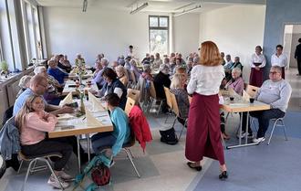Volles Haus beim Esthaler Bürgercafé. Begrüßung der Gäste durch Dorothea Esser