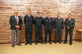 Das silberne FW-Ehrenzeichen für 25-jährige aktive, pflichtgetreue Tätigkeit bei der Feuerwehr wurden Hauptlöschmeister Christian Ziegler (FW Esthal), Hauptlöschmeister Andreas Braun (FW Frankeneck) und Brandmeister Mathias Singer (FW Iggelbach) verliehen.