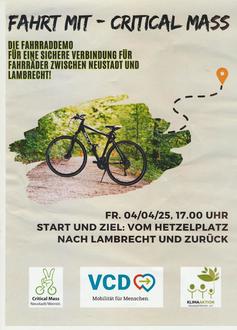 die 52. Critical Mass-Fahrraddemo in Neustadt/Weinstraße erkundet dieses Mal mit hoffentlich vielen Teilnehmenden den für Radfahrer:innen verbesserungsfähigen Weg von Neustadt nach Lambrecht. Wir werden auf den insgesamt 14 Km als Fahrradverbund laut § 27 der Straßenverkehrsordnung (StVO) gemeinsam als Gruppe fahren können.