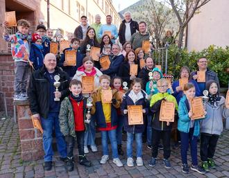 Nur glückliche Gesichter bot das Siegerbild des Eierpickens 2023 in Lambrecht. Insgesamt neun gespendete Pokale wurden in drei Disziplinen samt Urkunden vergeben.