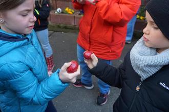 Zwei jugendliche Nachwuchspicker prüfen ihr Kampfobjekt, um anschließend die Härte der Eier zu testen.