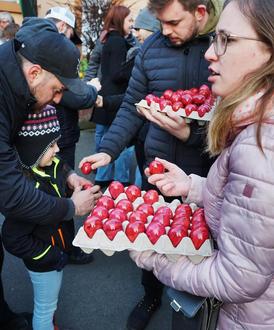 (ve) Einmal im Jahr und gerade für eine Stunde am Ostermontag frühmorgens zwischen 7 und 8 Uhr steht die Straßenkreuzung Karl-Marx-Straße - Walkstraße und Wallonenstraße in Alt-Lambrecht im Mittelpunkt des öffentlichen Interesses. Der kleine Straßenabschnitt von wenigen Quadratmetern beim Zusammentreffen der drei Straßen ist im eigentlichen Sinne gar kein „Platz“ und dennoch ist er als „Pickplatz“ allen Einheimischen geläufig, selbst wenn ihm die offizielle Namensnennung verwehrt blieb. Der Platz stand nach nun dreijähriger Corona-Unterbrechung wieder im Mittelpunkt des öffentlichen Interesses, denn das Eierpicken, das wohl drittälteste Traditionsfest in Lambrecht, lockte zahlreiche Frühaufsteher auf das Plätzchen im alten Lambrechter Stadtteil. An zwei Eierverkaufsstellen konnten die in diesem Jahr bordeauxrot gefärbten Eier erworben werden, zu einem Euro für drei Stück oder eine Palette mit 30 Eiern für zehn Euro. Insgesamt hatte der Verkehrsverein 2.500 Eier geordert, die in weniger als einer Stunde „verpickt“ waren.