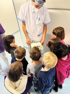 Einige Tage später stand der Besuch in der Zahnarztpraxis von Marin Ivanov mit der Projektgruppe an. Die Gruppe erkundete die Praxisräume, ihnen wurden die Arbeitsinstrumente eines Zahnarztes gezeigt und sie durften auf dem Behandlungsstuhl Platz nehmen. Passend hierzu besuchte Zahnarzt Dr. Ivanov die 4-6-jährigen einige Tage später in der Kindertagesstätte. Gespannt lauschten die Kinder den Erzählungen des Zahnarztes und erfuhren hierbei einiges Wissenswertes rund um ihre Zähne. Anhand des großen Gebisses und der übergroßen Zahnbürste zeigte Dr. Ivanov sehr anschaulich wie man seine Zähne richtig putzt. Ebenso wurde überlegt, welche Lebensmittel gesund für unsere Zähne sind und welche Lebensmittel unsere Zähne erkranken lassen. Um dies vorzubeugen und zu vermeiden, erklärte der Zahnarzt spielerisch, wie wichtig es ist, seine Zähne gründlich zu putzen und zweimal im Jahr den Zahnarzt zu besuchen. Jedes Kind erhielt zum Abschluss eine Zahnbürste, Zahnpasta mit Zahnbecher und eine Zahnputz-Urkunde.