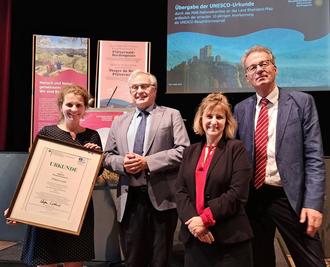 Übergabe der UNESCO-Urkunde an das Biosphärenreservat Pfälzerwald (v.l.n.r.): Biosphärenreservats-Direktorin Dr. Friedericke Weber, Bezirkstagsvorsitzender Theo Wieder, die rheinland-pfälzische Umweltministerin Katrin Eder und der Vorsitzende des MAB-Nationalkomitees, Dr. Stefan Lütkes