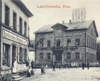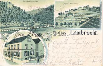 Da diese beiden Motive eigentlich keinen direkten Bezug zu Lambrecht haben, bleibt als einzige echte Verbindung vermutlich die dritte Abbildung: Eine Restauration mit Metzgerei von Philipp Messer.