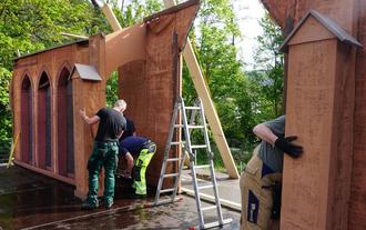 Die Klostermauern als passende Kulisse der Geißbock-Festspiele werden auf der Bühne des Tuchmacherplatzes aufgebaut.