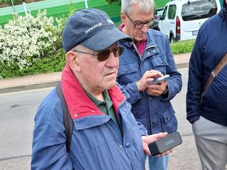 Bernhard Schmidt war auf der Wanderung für den Ton zuständig und trug den Lautsprecher über den Walter Klein die Audiodateien abspielte.