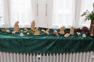 Der Aufbau einer größeren Krippe ist im Pfarrsaal jedoch aus Platzgründen nicht möglich. Stattdessen werden Krippenfiguren auf der Fensterbank arrangiert. Diese Aufgabe übernehmen Dorothea Müller und Elke Brucker gemeinschaftlich. Die Figuren stammen von Heiner Oppermann, der sie früher in der ehemaligen Kirche in Frankeneck aufgestellt hatte.