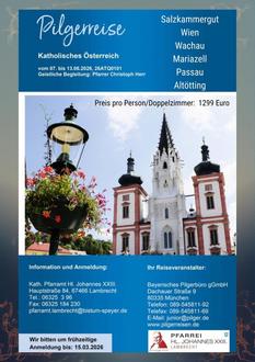 Lambrecht. (hk) Die Katholische Pfarrei Hl. Johannes XXIII. Lambrecht lädt in diesem Jahr zu einer besonderen Pilgerreise nach Österreich und Bayern ein. Die Reise findet vom 7. bis 13. Juni 2026 statt und führt zu bedeutenden religiösen und kulturellen Orten im katholischen Österreich sowie nach Bayern.