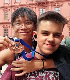 Zwei junge Sportler mit der Medaille der Teilnahme am Gutenberg-Marathon „Schüler-Ekidenlauf“.