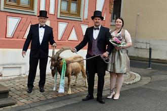 Stadtbürgermeister Karl-Günter Müller, Geißbock-Brautpaar und Tributbock