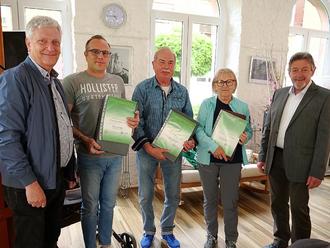 Die beiden Vorsitzenden Gunther Weber (links) und Rainer Heckmann umrahmen die Familie Klein bestehend aus Stefan Klein, Friedhelm Klein und Ursula Klein (von links).