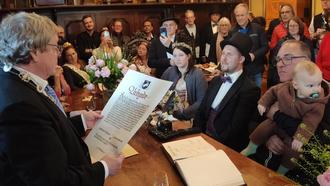 An der Deidesheimer Waldhütte verlas der fürstbischöfliche Waldhüter Jan Hock den Geleitbrief der Brautleute.