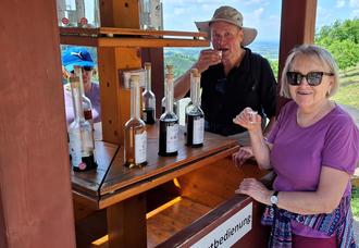 Für den knapp 14 Kilometer langen Qualitätswanderweg, auf dem ca. 450 Höhenmeter bewältigt werden müssen, war der Startpunkt für die Pfälzerwäldler der „Wanderparkplatz Hesselbach“. Teilweise verläuft der Brennersteig parallel mit dem „Kandelweg“, der auf einer Länge von 110 Kilometer von Oberkirch nach Freiburg führt. Der Steig führte die Wandergruppe über schmale Waldpfade, Forst- und Wiesenwege durch traumhaft schöne Wald-, Obst- und Reblandschaften rund um das Hesselbacher Tal. Er erzählt, anschaulich auf Schautafeln dokumentiert, die Geschichte der lokalen Brennkultur. Am Wegesrand entdeckte man zahlreiche Brennereien, die an „Selbstbedienungseinrichtungen“, gegen einen preiswerten Obolus zur Verköstigung einluden. An den „Tankstellen“ werden außerdem auch nicht alkoholische Getränke angeboten, was dem Fahrer sehr entgegen kam. Auf dem Gipfel des „Geigerskopf“ mit seinem 20 Meter hohen Aussichtsturm hatte man die meisten Höhenmeter bewältigt und es war Zeit für eine längere Rast. Drei ganz „Ungeduldige“ bestiegen als erstes den „Geigerskopfturm“ und waren von der tollen 360 Grad Aussicht begeistert. Über die Rheinebene bis zu den Vogesen, nach Straßburg mit Münster und zur Hornisgrinde reichte die Aussicht. Nach der ausgiebigen Rast an der Schutzhütte ging es für die Wandergruppe zunächst bergab Richtung „Busseck Hof“. Hier bot sich auf der Anhöhe noch einmal ein toller Ausblick über die Rheinebene. Über den „Köbelesberghof „und den „Fießhof“, die letzte „Tankstelle“ der Wanderung, und vorbei am Gasthof „Hesselbacher Hof“ erreichte die Wandergruppe wieder den Ausgangspunkt der Tour am Wanderparkplatz.