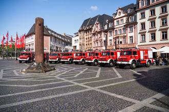 Acht neue Tanklöschfahrzeuge (TLF 3000) an sieben Verbandsgemeinden und die Stadt Pirmasens übergeben.