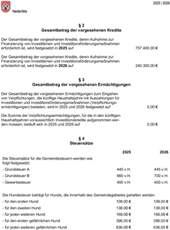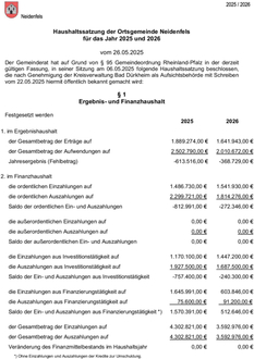 Gemäß §§ 97 Abs. 2, 27 GemO und DVO-GemO in Verbindung mit der Hauptsatzung liegt die Haushaltssatzung mit –plan und Anlagen für 2025 und 2026 in der Zeit von