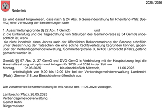 Es wird darauf hingewiesen, dass nach § 24 Abs. 6 Gemeindeordnung für Rheinland-Pfalz (GemO) eine Verletzung der Bestimmungen über
