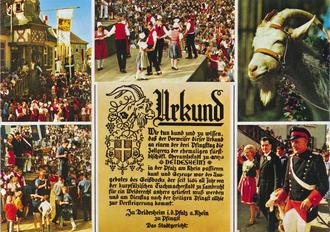 Aus der großen Postkartensammlung von Udo Grimm habe ich diese Woche eine besonders farbenfrohe Ansichtskarte ausgewählt. Sie stammt aus dem renommierten Verlag Gebr. Metz in Tübingen und zeigt einen eindrucksvollen Moment der traditionellen Geißbockversteigerung in Deidesheim im Jahr 1969.