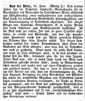 "Seit uralten Zeiten hat die Gemeinde Lambrecht-Grevenhausen für die Gerechtigkeit des Weiderechtes im Deidesheimer Walde alljährlich auf Pfingstsonntag einen wohlgehörnten und wohlgenährten Bock durch die betreffenden Walddistrikte abzuliefern. Der jüngste Bürger von Lambrecht-Grevenhausen ist in eigener Person oder durch Lohnleute zum Bockführerdienst verpflichtet. Ist der Bock nicht zur rechten Zeit und in guter Qualität abgeliefert, so erlischt das Weiderecht, von dem jetzt mancher arme Hausvater durch das zur Weide getriebene Kühlein den Sommer über seine Familie erhält. Die stolzen Lambrechter wollten den reichen Deidesheimer schon öfter den Bocktribut mit Geld abkaufen, aber dazu sind die Deidesheimer auch zu großartig. Denn wenn der noble Bock kommt, und dann im Orte versteigert wird, so ist dies jedes Mal ein flottes Fest für Alle, besonders aber für die liebe Jugend.