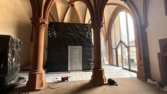 Im Vorraum der Kirche ist im Bereich des Duchbruches ein provisorischer Arbeitsraum errichtet worden.